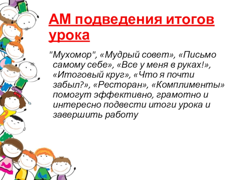 у меня в руках!», «Итоговый круг», «Что я почти забыл?», «Ресторан», «Комплименты» помогут эффективно, грамотно и интересно подвести итоги урока и завершить работу