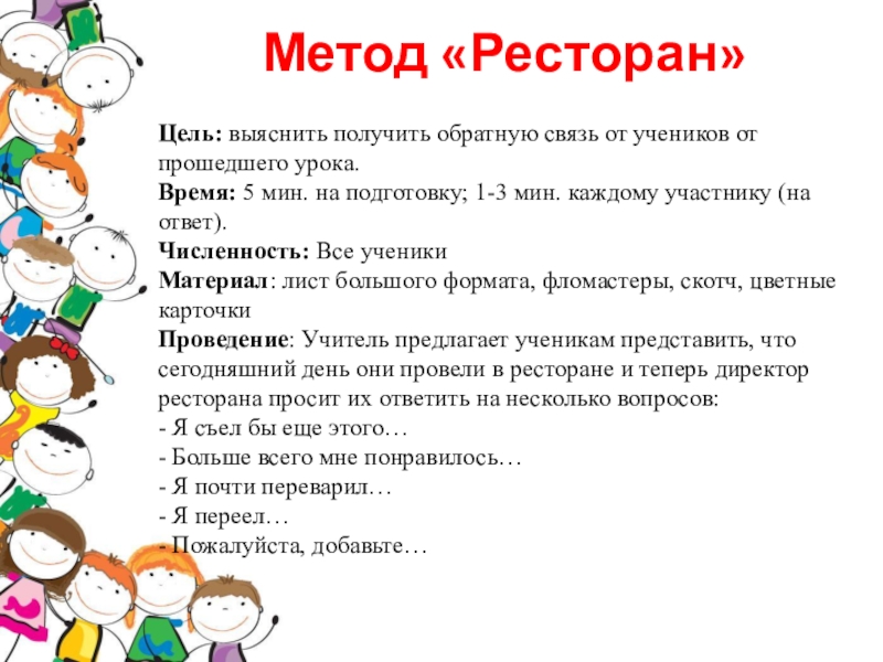 Проведение: Учитель предлагает ученикам представить, что сегодняшний день они провели в ресторане и теперь директор ресторана просит их ответить на несколько вопросов: