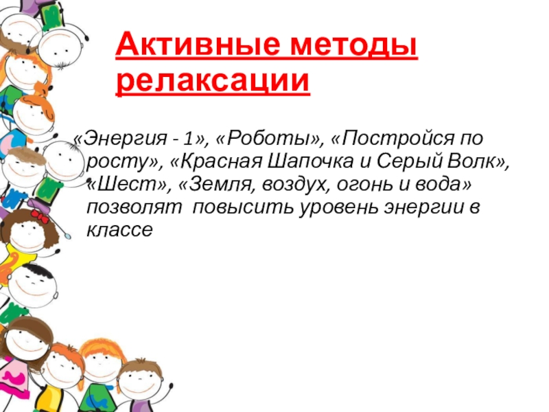 и Серый Волк», «Шест», «Земля, воздух, огонь и вода» позволят повысить уровень энергии в классе
