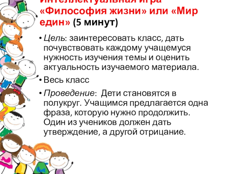 Слайд 21Интеллектуальная игра «Философия жизни» или «Мир един» (5 минут)