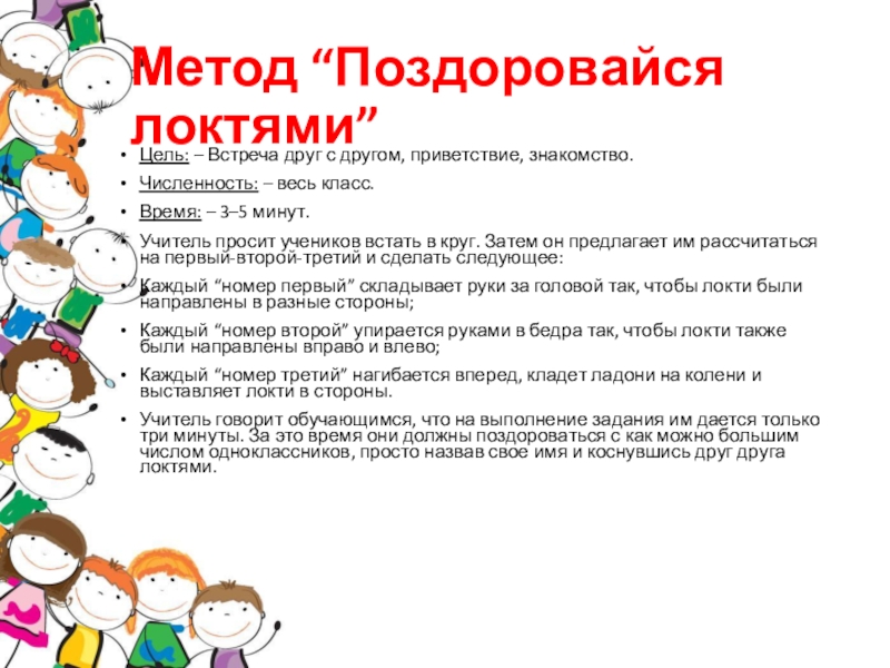 Учитель говорит обучающимся, что на выполнение задания им дается только три минуты. За это время они должны поздороваться с как можно большим числом одноклассников, просто назвав свое имя и коснувшись друг друга локтями.