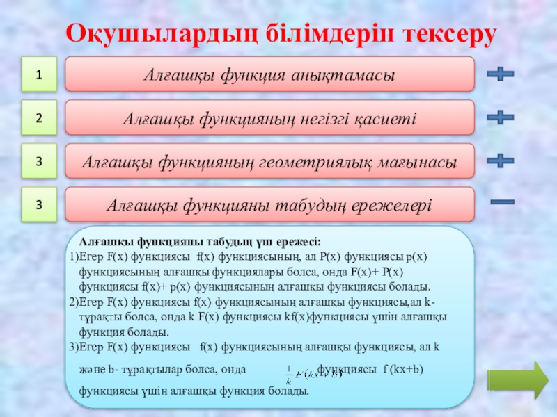 Егер F(x) функциясы f(x) функциясының, ал Р(х) функциясы р(х) функциясының алғашқы функциялары болса, онда F(x)+ Р(x) функциясы f(x)+ р(х) функциясының алғашқы функциясы болады.
