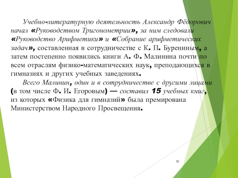 Слайд 10 Учебно-литературную деятельность Александр Фёдорович начал «Руководством Тригонометрии», за ним следовали «Руководство