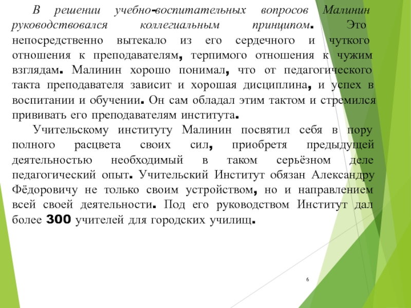 Слайд 6 В решении учебно-воспитательных вопросов Малинин руководствовался коллегиальным принципом. Это непосредственно вытекало