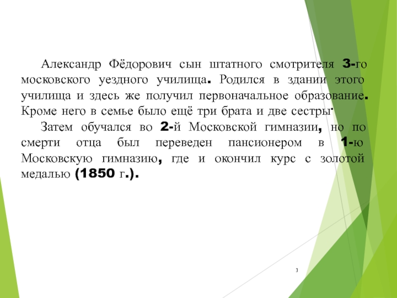 Слайд 3 Александр Фёдорович сын штатного смотрителя 3-го московского уездного училища. Родился в