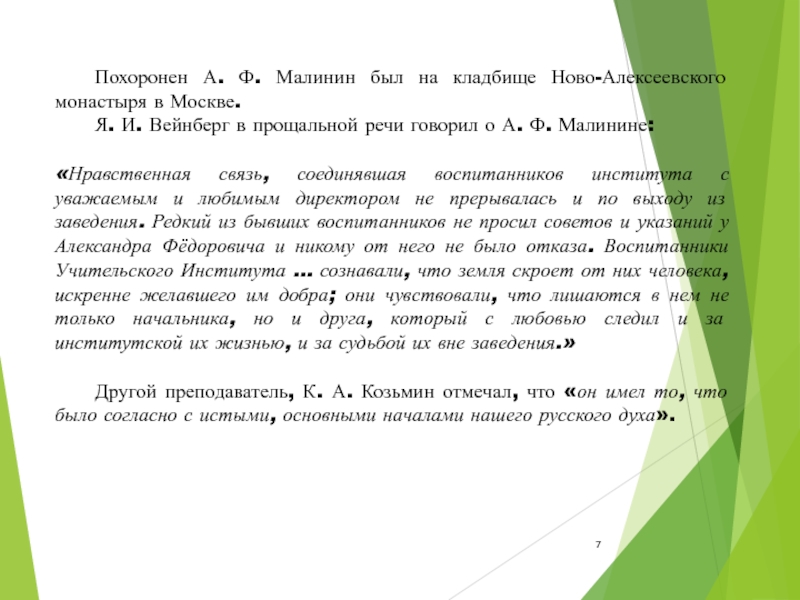Слайд 7 Похоронен А. Ф. Малинин был на кладбище Ново-Алексеевского монастыря в Москве.