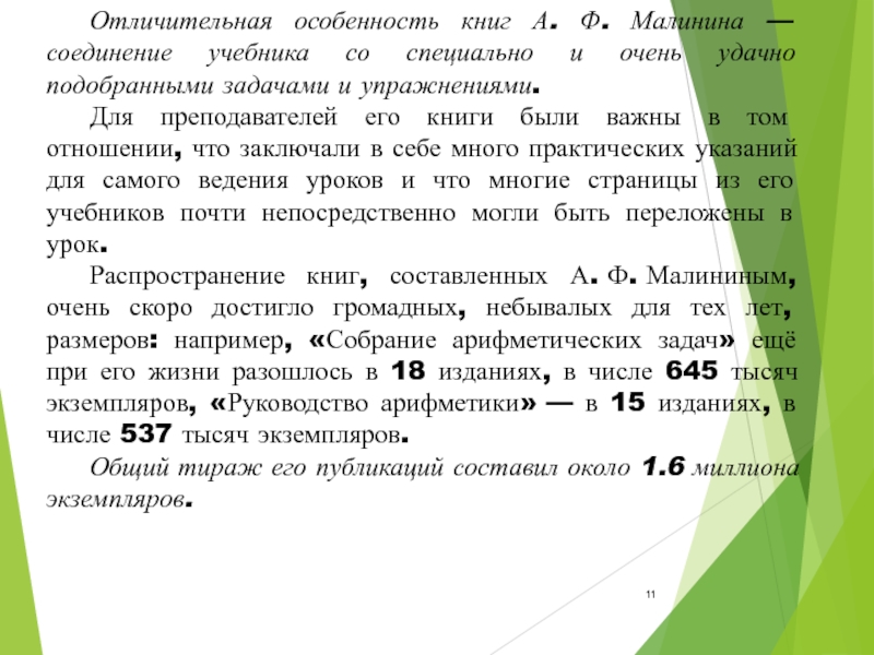 Слайд 11 Отличительная особенность книг А. Ф. Малинина — соединение учебника со специально