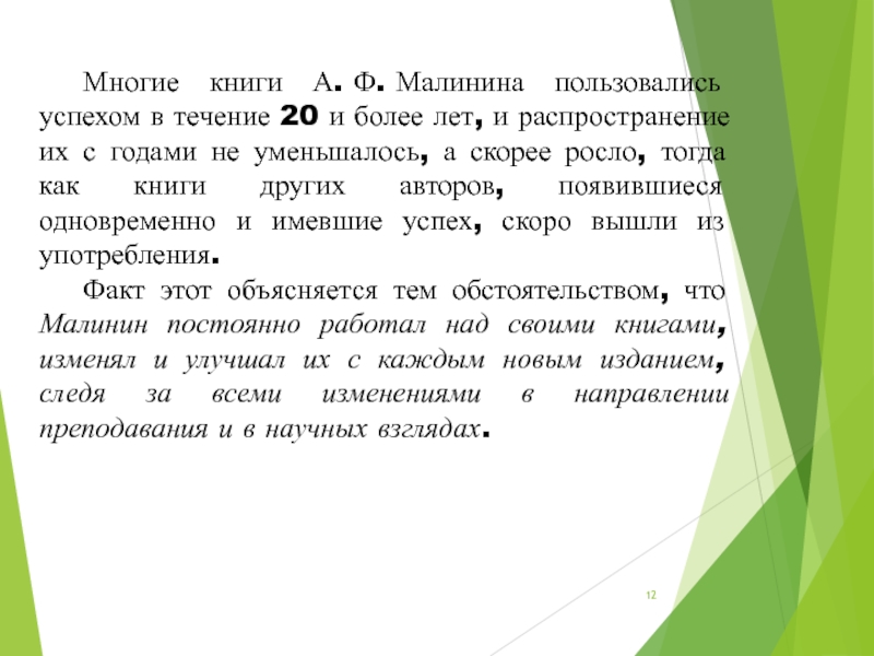 Слайд 12 Многие книги А. Ф. Малинина пользовались успехом в течение 20 и более лет,