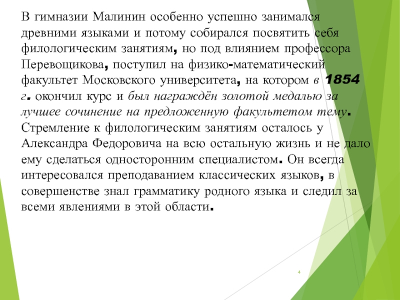 Слайд 4В гимназии Малинин особенно успешно занимался древними языками и потому собирался