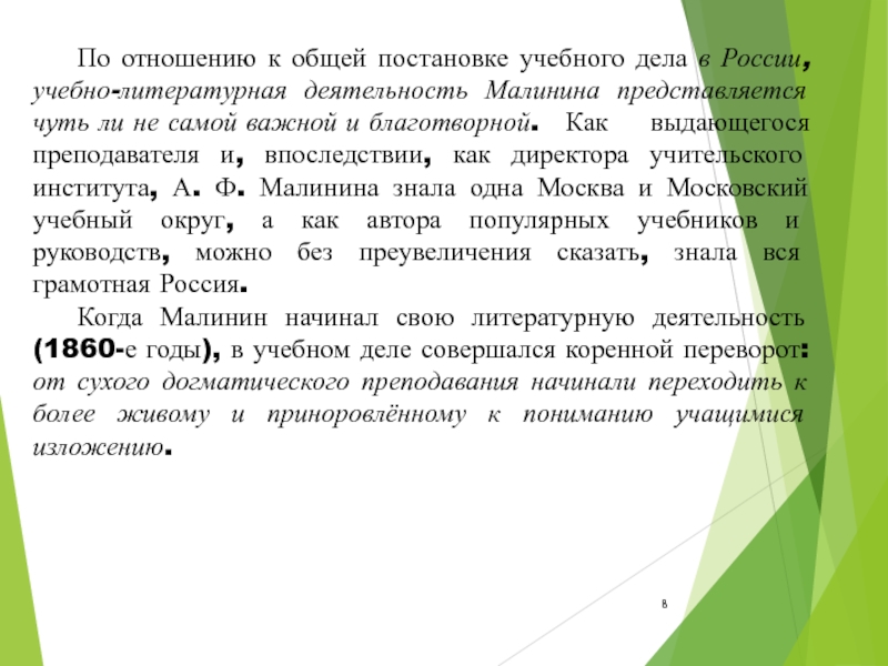Слайд 8 По отношению к общей постановке учебного дела в России, учебно-литературная деятельность