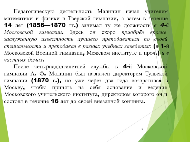 Слайд 5 Педагогическую деятельность Малинин начал учителем математики и физики в Тверской гимназии,