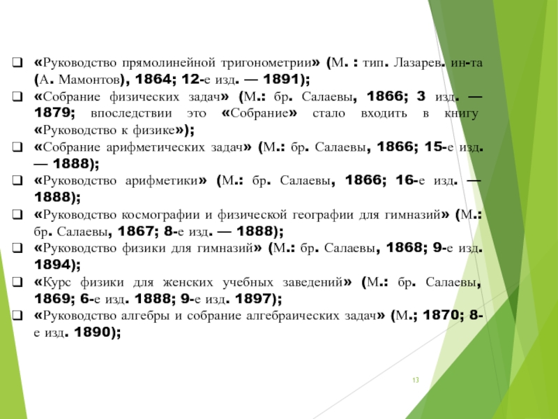 Слайд 13«Руководство прямолинейной тригонометрии» (М. : тип. Лазарев. ин-та (А. Мамонтов), 1864; 12-е