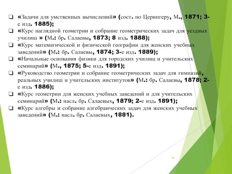 «Курс геометрии для женских учебных заведений и для учительских семинарий» (М.: насл. бр. Салаевых, 1879; 2-е изд. 1891);