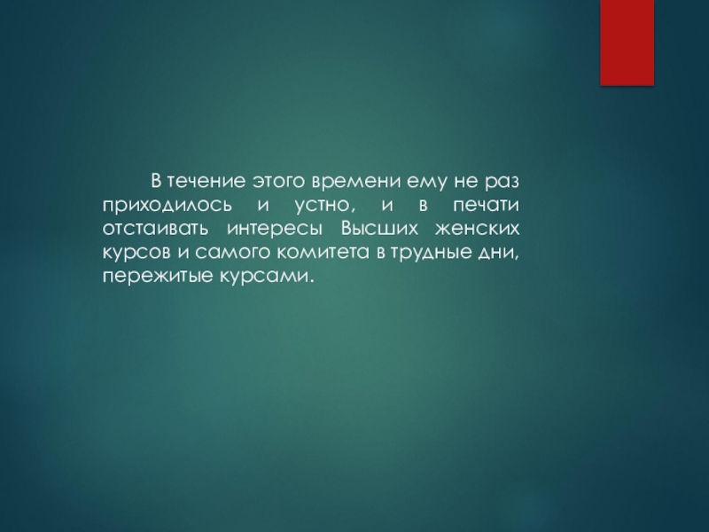 приходилось и устно, и в печати отстаивать интересы Высших женских курсов и самого комитета в трудные дни, пережитые курсами.