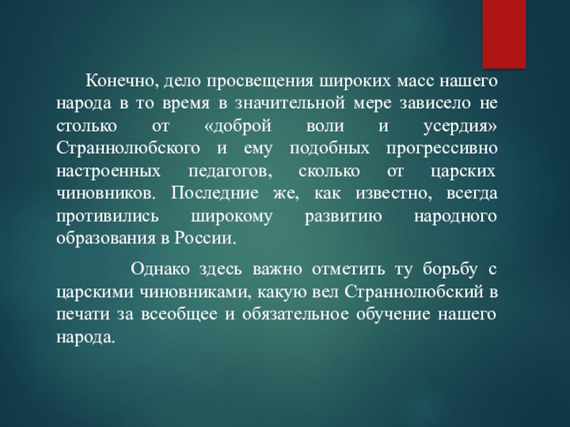 народа в то время в значительной мере зависело не столько от «доброй воли и усердия» Страннолюбского и ему подобных прогрессивно настроенных педагогов, сколько от царских чиновников. Последние же, как известно, всегда противились широкому развитию народного образования в России.
