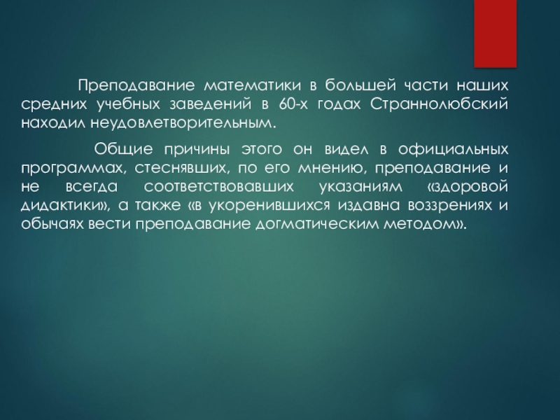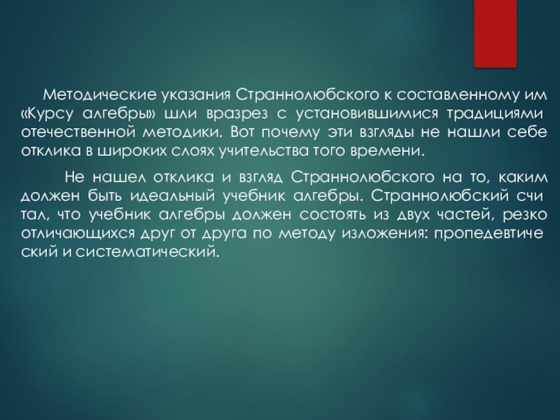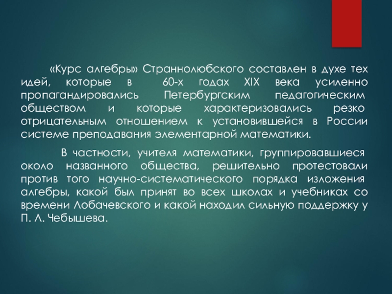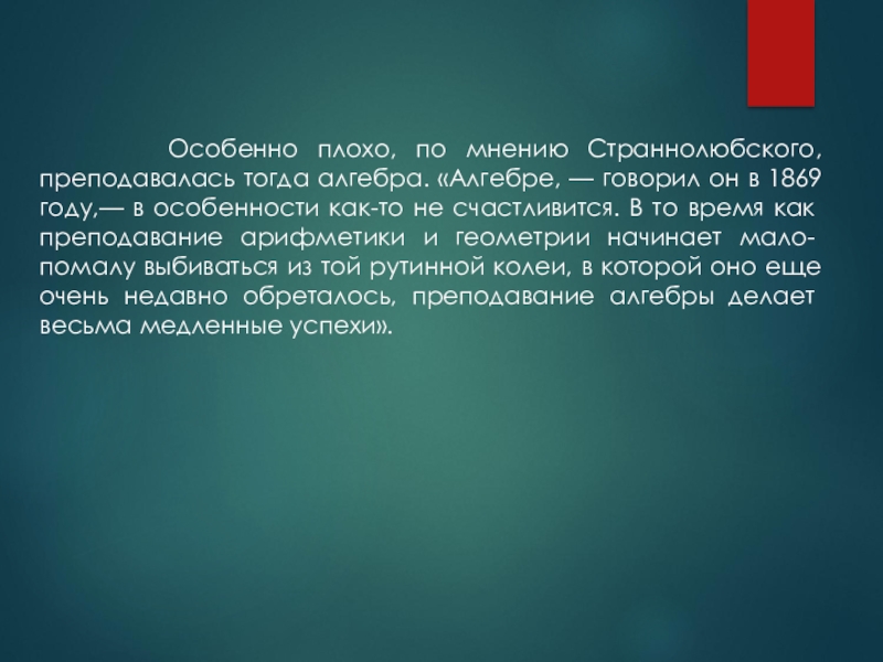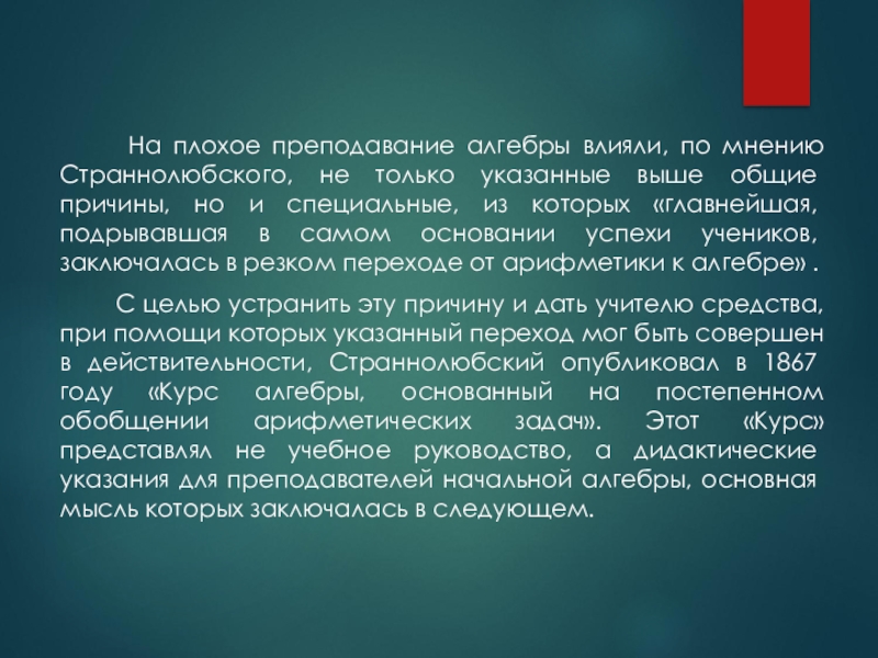 Слайд 29 На плохое преподавание алгебры влияли, по мнению Страннолюбского,