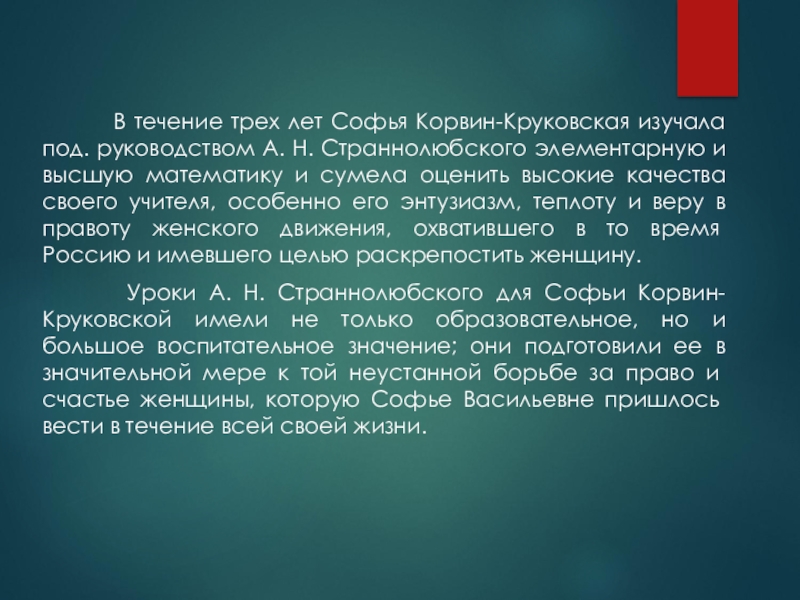 Уроки А. Н. Страннолюбского для Софьи Корвин-Круковской имели не только образовательное, но и большое воспитательное значение; они подготовили ее в значительной мере к той неустанной борьбе за право и счастье женщины, которую Софье Васильевне пришлось вести в течение всей своей жизни.