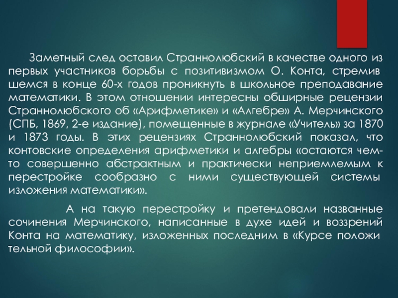 первых участников борьбы с позитивизмом О. Конта, стремившемся в конце 60-х годов проникнуть в школьное преподавание математики. В этом отношении интересны обширные рецензии Страннолюбского об «Арифметике» и «Алгебре» А. Мерчинского (СПБ, 1869, 2-е издание), помещенные в журнале «Учитель» за 1870 и 1873 годы. В этих рецензиях Страннолюбский показал, что контовские определения арифметики и алгебры «остаются чем-то совершенно абстрактным и практически неприемлемым к перестройке сообразно с ними существующей системы изложения математики».