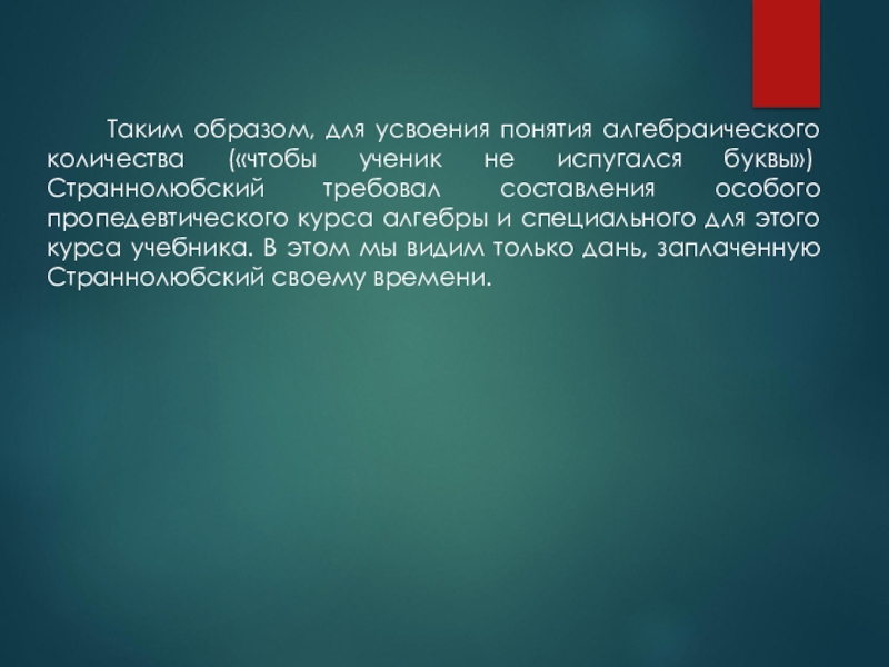 ученик не испугался буквы») Страннолюбский требовал составления особого пропедевтического курса алгебры и специального для этого курса учебника. В этом мы видим только дань, заплаченную Страннолюбский своему времени.