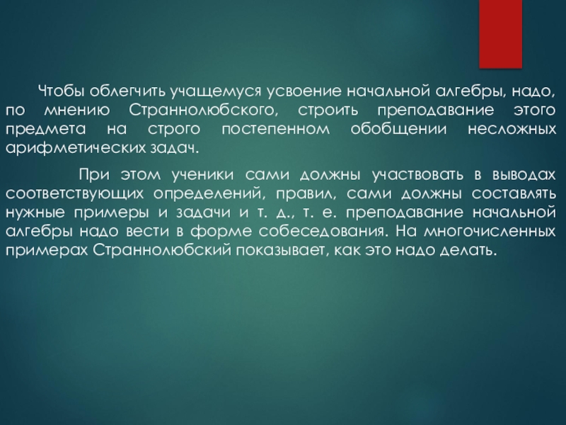 по мнению Страннолюбского, строить преподавание этого предмета на строго постепенном обобщении несложных арифметических задач.