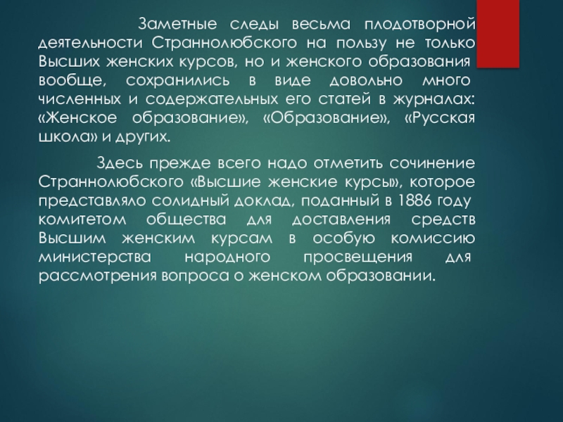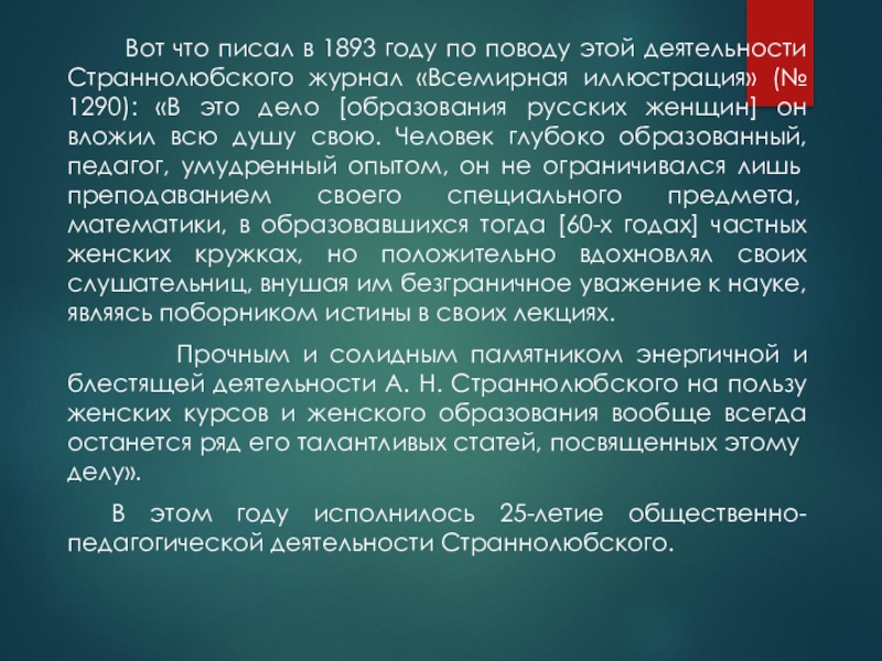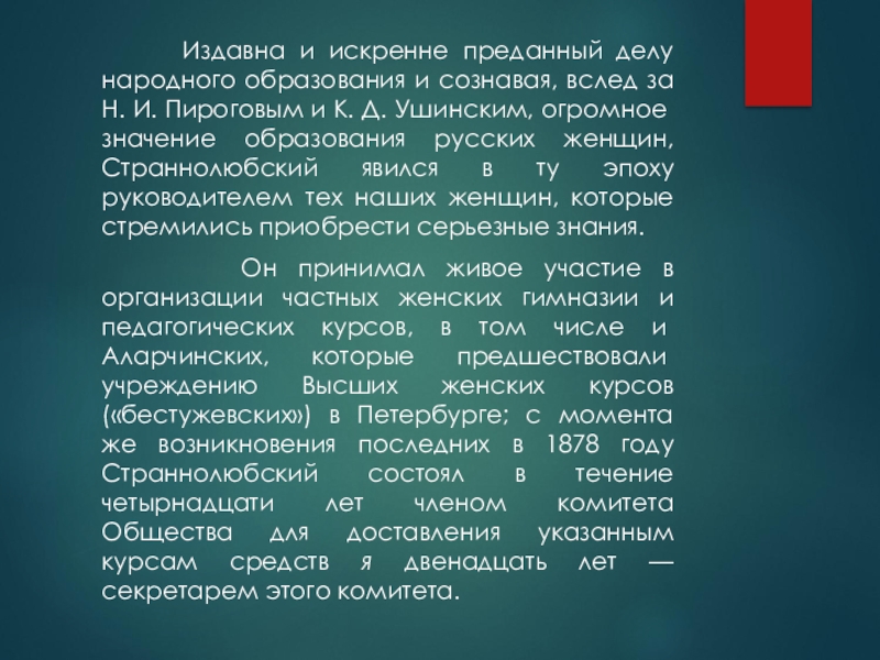 Слайд 12А. Н. Страннолюбский и женское образование в России