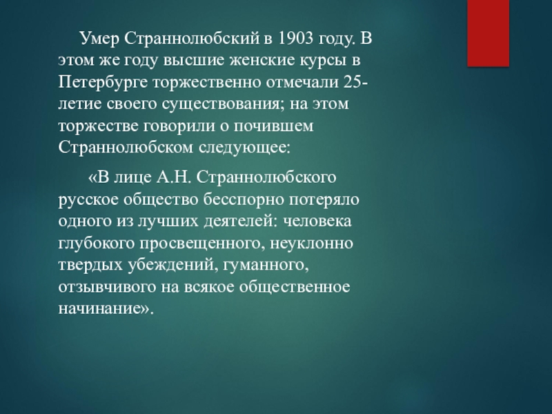 Слайд 10 Умер Страннолюбский в 1903 году. В