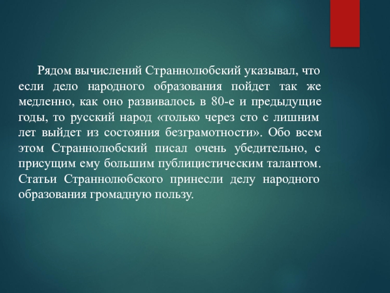 дело народного образования пойдет так же медленно, как оно развивалось в 80-е и предыдущие годы, то русский народ «только через сто с лишним лет выйдет из состояния безграмотности». Обо всем этом Страннолюбский писал очень убедительно, с присущим ему большим публицистическим талантом. Статьи Страннолюбского принесли делу народного образования громадную пользу.