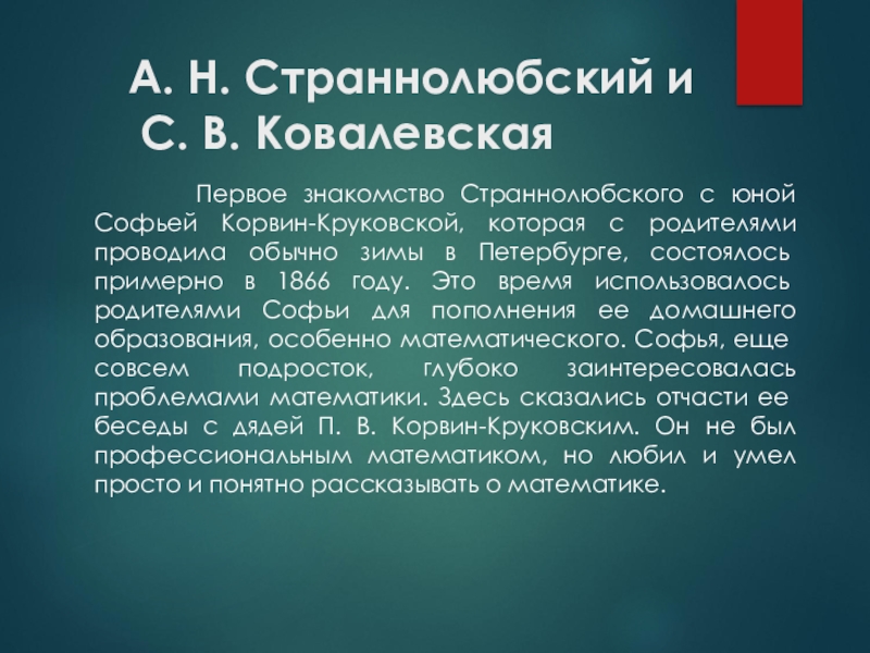 знакомство Страннолюбского с юной Софьей Корвин-Круковской, которая с родителями проводила обычно зимы в Петербурге, состоялось примерно в 1866 году. Это время использовалось родителями Софьи для пополнения ее домашнего образования, особенно математического. Софья, еще совсем подросток, глубоко заинтересовалась проблемами математики. Здесь сказались отчасти ее беседы с дядей П. В. Корвин-Круковским. Он не был профессиональным математиком, но любил и умел просто и понятно рассказывать о математике.