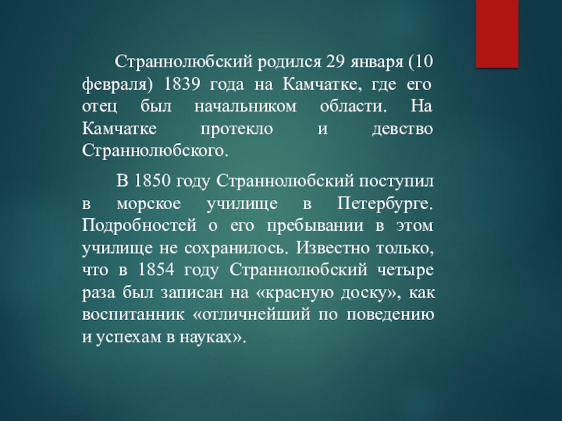 февраля) 1839 года на Камчатке, где его отец был начальником области. На Камчатке протекло и девство Страннолюбского.
