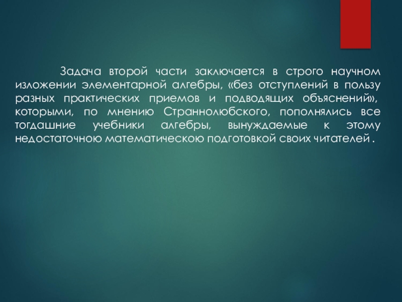 элементарной алгебры, «без отступлений в пользу разных практических приемов и подводящих объяснений», которыми, по мнению Страннолюбского, пополнялись все тогдашние учебники алгебры, вынуждаемые к этому недостаточною математическою подготовкой своих читателей .