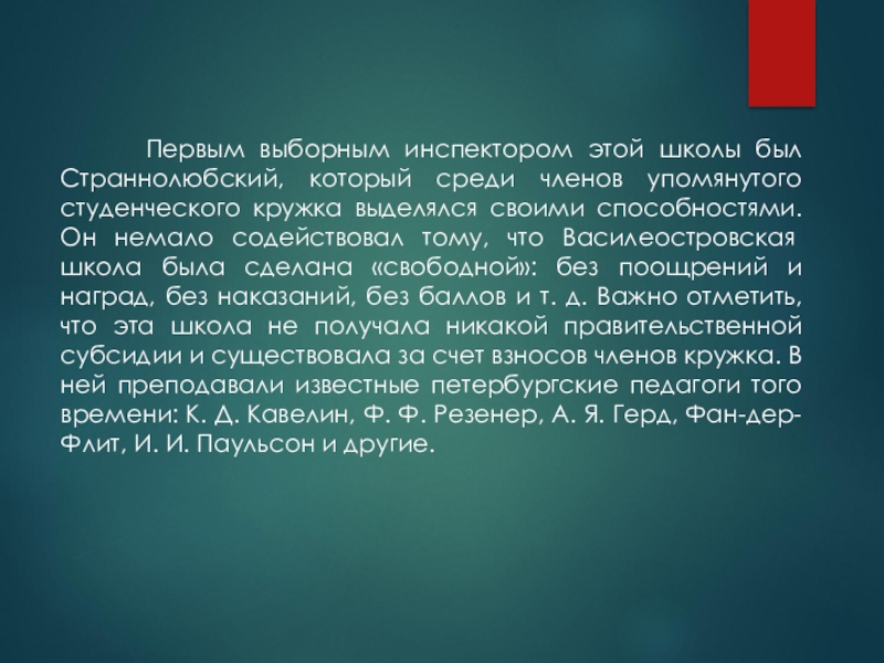 Слайд 23 Первым выборным инспектором этой школы был Страннолюбский, который