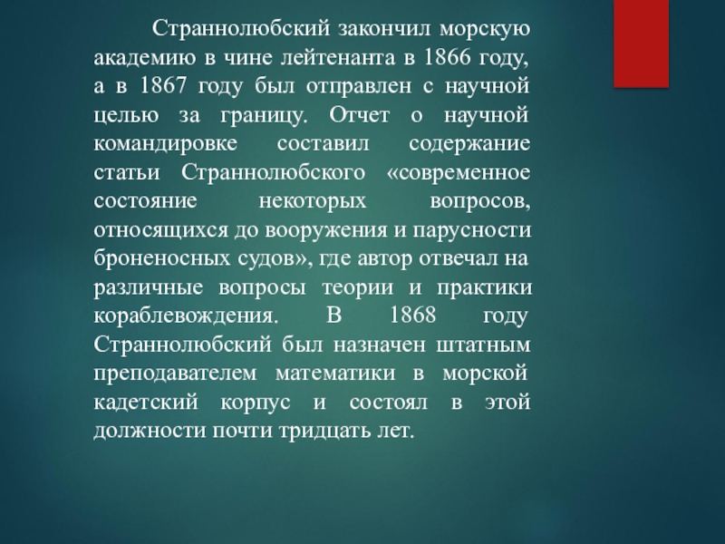 чине лейтенанта в 1866 году, а в 1867 году был отправлен с научной целью за границу. Отчет о научной командировке составил содержание статьи Страннолюбского «современное состояние некоторых вопросов, относящихся до вооружения и парусности броненосных судов», где автор отвечал на различные вопросы теории и практики кораблевождения. В 1868 году Страннолюбский был назначен штатным преподавателем математики в морской кадетский корпус и состоял в этой должности почти тридцать лет.
