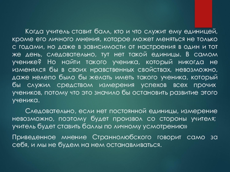 Следовательно, если нет постоянной единицы, измерение невозможно, поэтому будет произвол со стороны учителя; учитель будет ставить баллы по личному усмотрению»