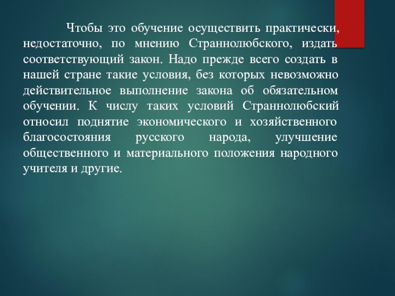 недостаточно, по мнению Страннолюбского, издать соответствующий закон. Надо прежде всего создать в нашей стране такие условия, без которых невозможно действительное выполнение закона об обязательном обучении. К числу таких условий Страннолюбский относил поднятие экономического и хозяйственного благосостояния русского народа, улучшение общественного и материального положения народного учителя и другие.
