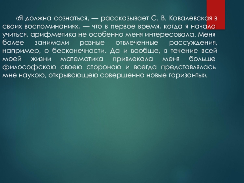 в своих воспоминаниях, — что в первое время, когда я начала учиться, арифметика не особенно меня интересовала. Меня более занимали разные отвлеченные рассуждения, например, о бесконечности. Да и вообще, в течение всей моей жизни математика привлекала меня больше философскою своею стороною и всегда представлялась мне наукою, открывающею совершенно новые горизонты».