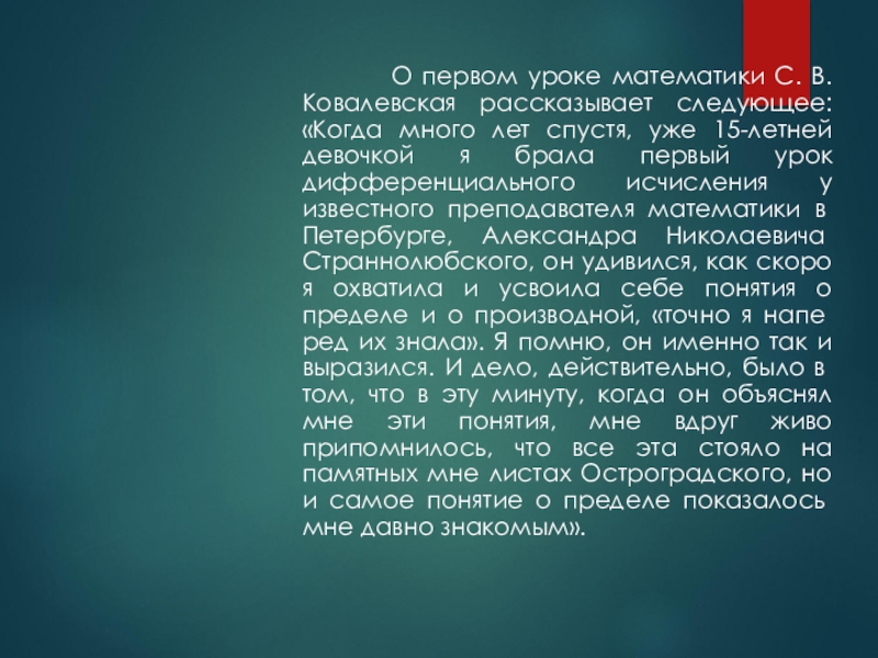 Ковалевская рассказывает следующее: «Когда много лет спустя, уже 15-летней девочкой я брала первый урок дифференциального исчисления у известного преподавателя математики в Петербурге, Александра Николаевича Страннолюбского, он удивился, как скоро я охватила и усвоила себе понятия о пределе и о производной, «точно я наперед их знала». Я помню, он именно так и выразился. И дело, действительно, было в том, что в эту минуту, когда он объяснял мне эти понятия, мне вдруг живо припомнилось, что все эта стояло на памятных мне листах Остроградского, но и самое понятие о пределе показалось мне давно знакомым».