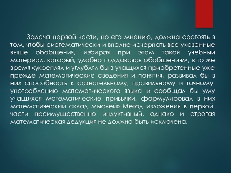 состоять в том, чтобы систематически и вполне исчерпать все указанные выше обобщения, избирая при этом такой учебный материал, который, удобно поддаваясь обобщениям, в то же время «укреплял и углублял бы в учащихся приобретенные уже прежде математические сведения и понятия, развивал бы в них способность к сознательному, правильному и точному употреблению математического языка и сообщал бы уму учащихся математические привычки, формулировал в них математический склад мыслей» Метод изложения в первой части преимущественно индуктивный, однако и строгая математическая дедукция не должна быть исключена.