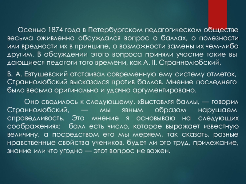 В. А. Евтушевский отстаивал современную ему систему отметок, Страннолюбский высказался против баллов. Мнение последнего было весьма оригинально и удачно аргументировано.