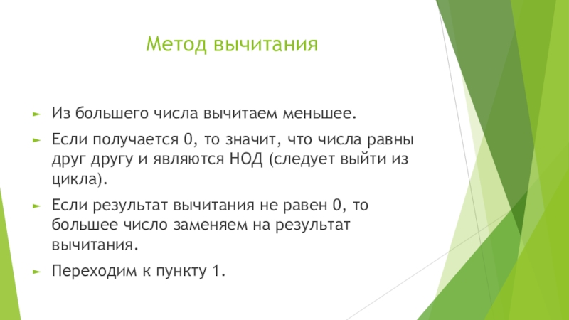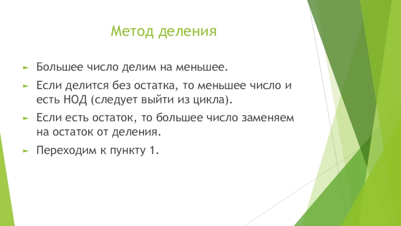 Метод деленияБольшее число делим на меньшее.Если делится без остатка, то меньшее число и есть НОД (следует выйти