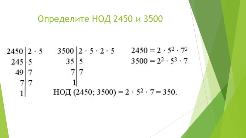 Нахождение НОДЧтобы найти НОД двух или более натуральных чисел нужно:1) Разложить числа на простые множители.2) Взять одинаковые простые