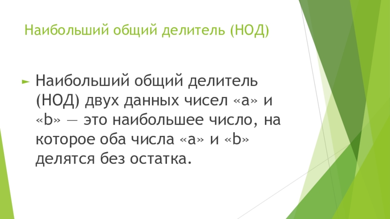 Наибольший общий делитель (НОД)Наибольший общий делитель (НОД) двух данных чисел «a» и «b» — это наибольшее число,