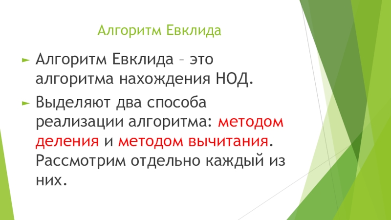 Алгоритм ЕвклидаАлгоритм Евклида – это алгоритма нахождения НОД.Выделяют два способа реализации алгоритма: методом деления и методом вычитания.