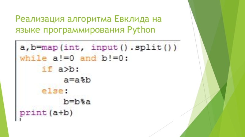 Слайд 17Реализация алгоритма Евклида на языке программирования Python