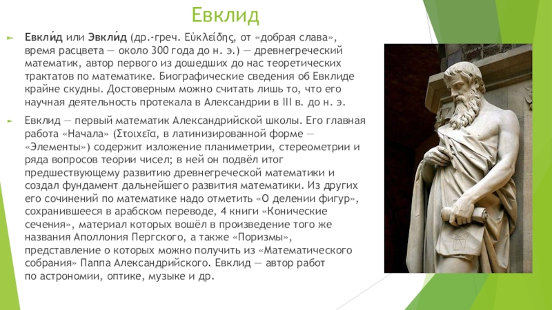 ЕвклидЕвкли́д или Эвкли́д (др.-греч. Εὐκλείδης, от «добрая слава», время расцвета — около 300 года до н. э.) — древнегреческий математик, автор первого из дошедших до