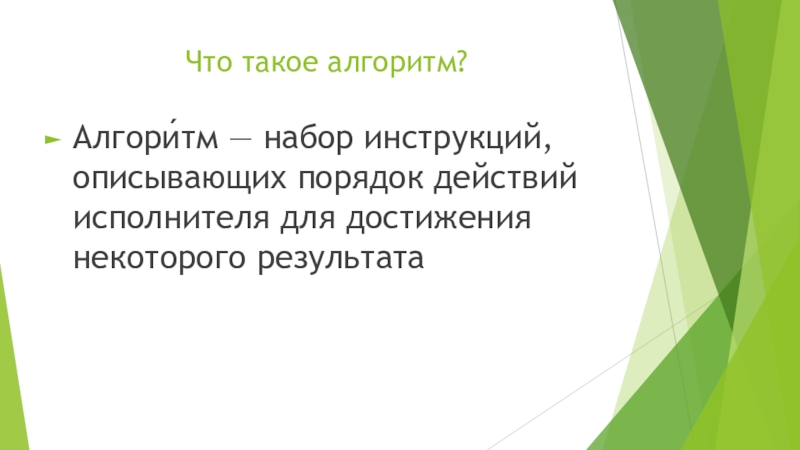 Что такое алгоритм?Алгори́тм — набор инструкций, описывающих порядок действий исполнителя для достижения некоторого результата