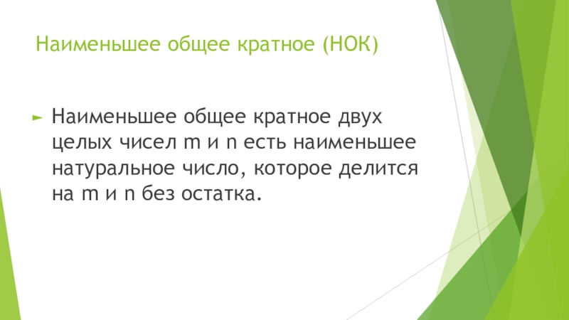 Наименьшее общее кратное (НОК)Наименьшее общее кратное двух целых чисел m и n есть наименьшее натуральное число, которое