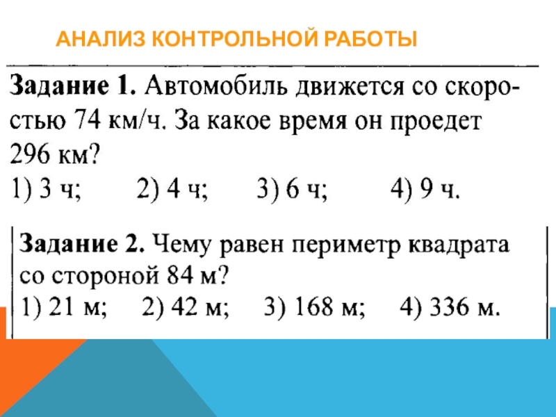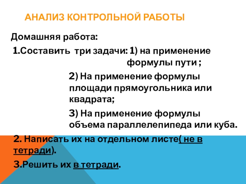 Анализ контрольной работыДомашняя работа: 1.Составить три задачи: 1) на применение формулы пути ;2) На применение формулы площади