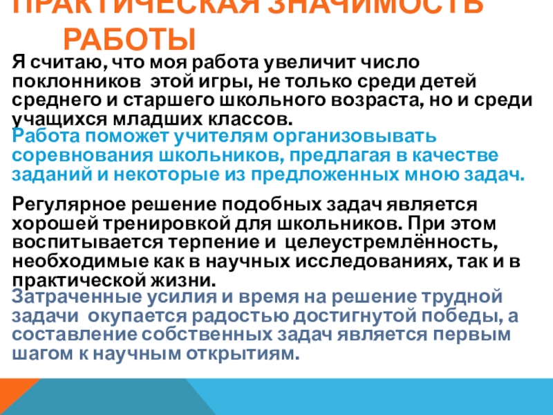 Я считаю, что моя работа увеличит число поклонников этой игры, не только среди детей среднего и старшего школьного возраста, но и среди учащихся младших классов.