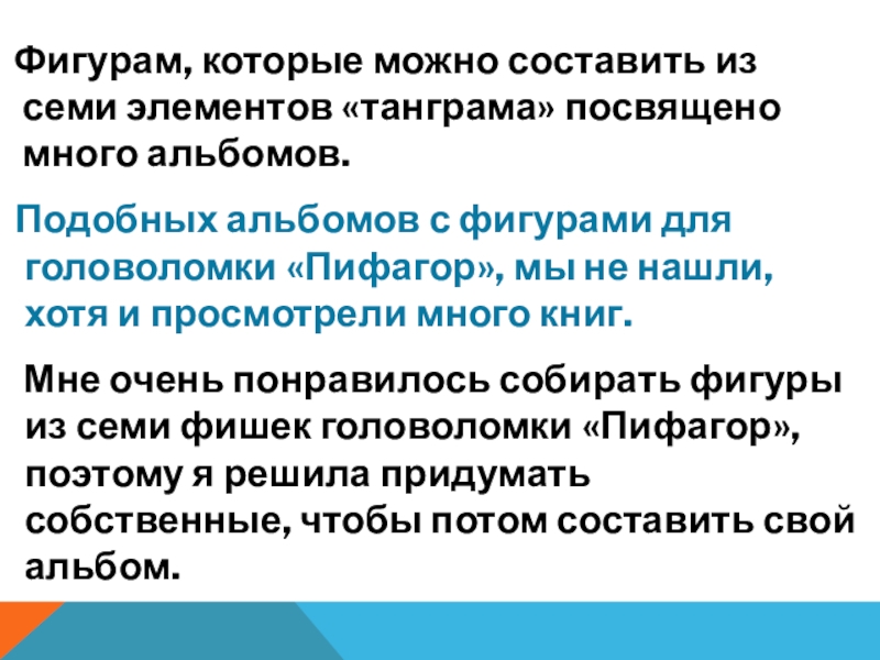 Подобных альбомов с фигурами для головоломки «Пифагор», мы не нашли, хотя и просмотрели много книг.
