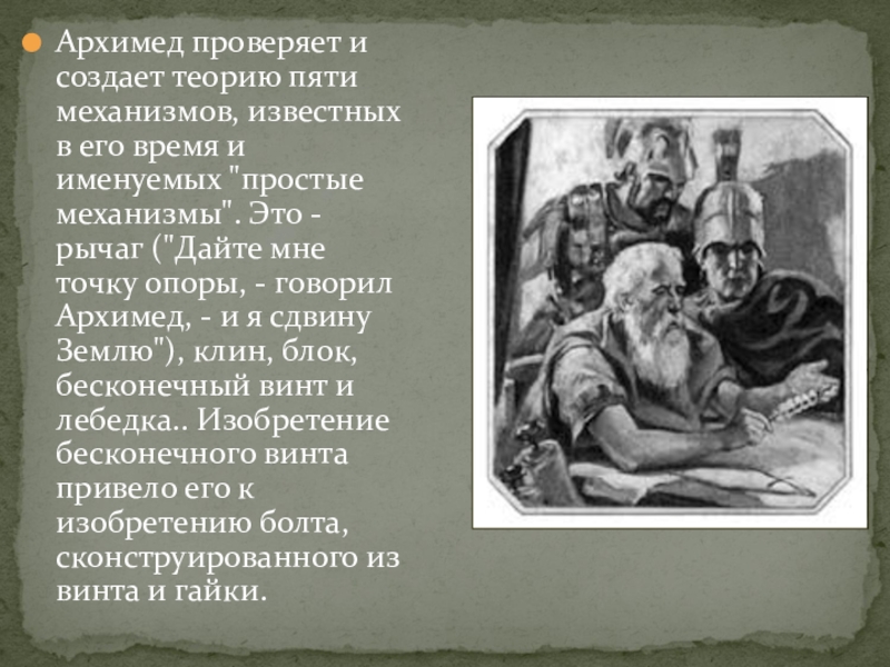 и именуемых "простые механизмы". Это - рычаг ("Дайте мне точку опоры, - говорил Архимед, - и я сдвину Землю"), клин, блок, бесконечный винт и лебедка.. Изобретение бесконечного винта привело его к изобретению болта, сконструированного из винта и гайки.